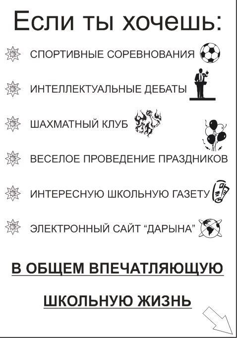 Нуржан, за дебаты,шахматы и все остальное будет отвечать конкретный человек(для этого и существует школьное правительство). Школьная газета обязательно будет, время найдем.(она и создается для того, что раскрыть таланты учащихся, именно здесь будут публиковаться их творческие работы). Насчет Web-сайта: я закончила полный курс в компьютерной школе на Веб-дизайнера(сайты создавать умею). - наш, дарыновский сайт будет готов через несколько дней. И это не дорого, все зависит от хостинга. Насчет лампочки и др. проблем: Если стану президентом, в первую очередь займусь этим! Надеюсь, мои ответы убедительны.